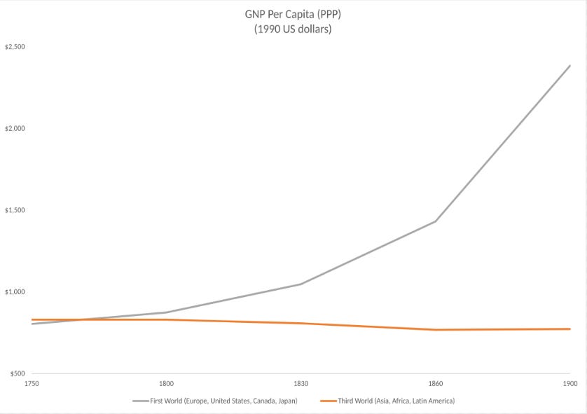 So, that’s to say that in the year 1775, GNP Per Capita or the total value of all goods and services made, divided by population, in BOTH First World and Third World countries was identical:
