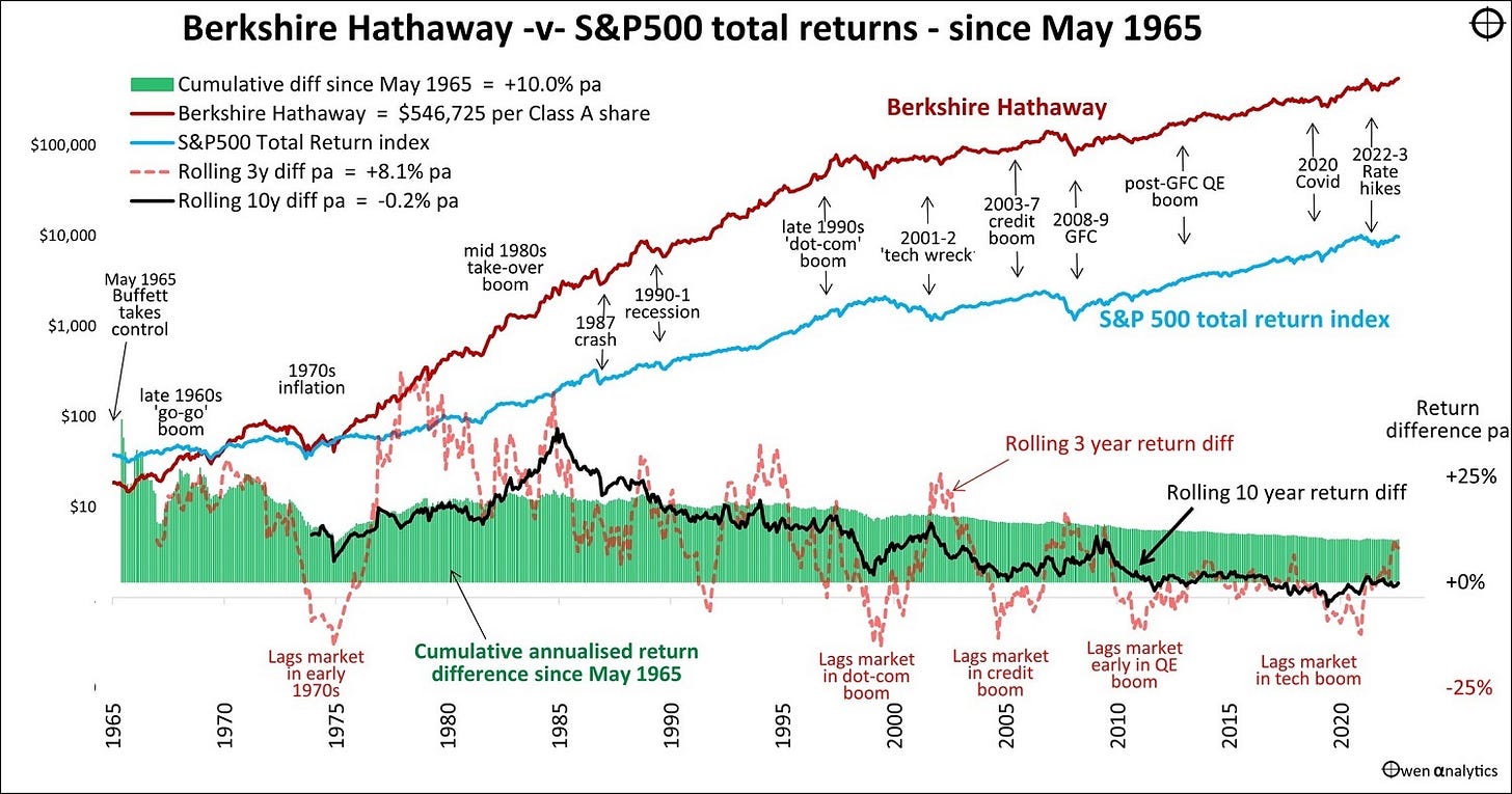 The red line = Berkshire Hathaway (Warren Buffet’s investment company) share price from 1965 to 2025 (60 years of investing).